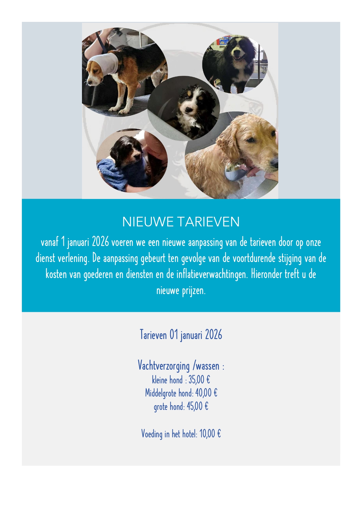 Opgelet! Vanaf 1 januari 2026 worden de tarieven aangepast voor de dienstverlening rond wassen en vachtverzorging, evenals voor het gebruik van de hotelvoeding voor jouw maatje. Deze wijziging is het gevolg van de aanhoudende stijging van de kosten van goederen en diensten en de inflatieverwachtingen. Hieronder staan de nieuwe prijzen.